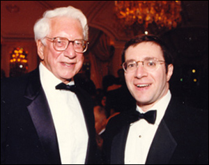 Carl Lindner, Chairman of the American Financial Group, best known for its development of the Chiquita Banana Brand of products being congratulated by Irwin Katsof at a Jerusalem Fund dinner. |